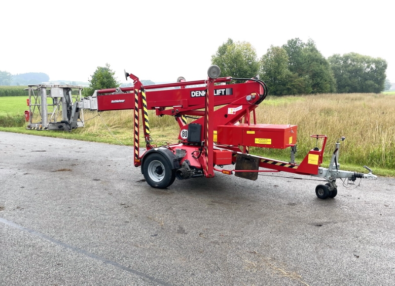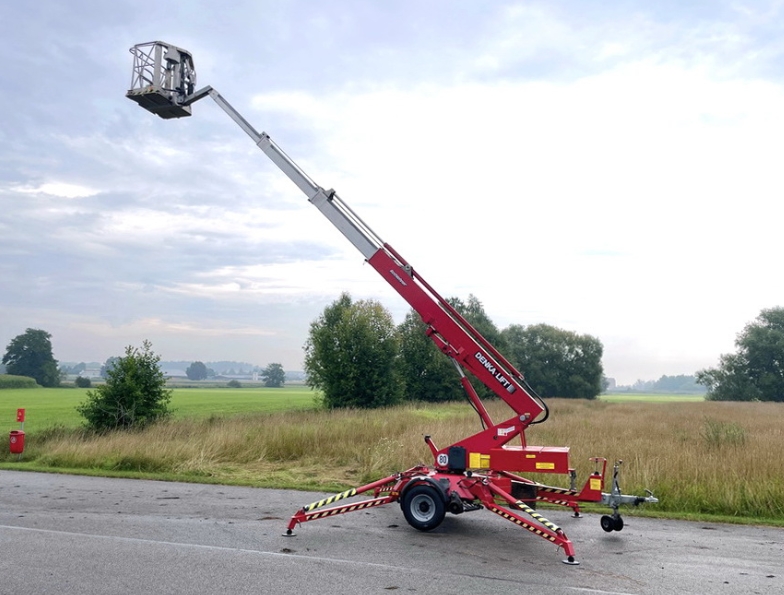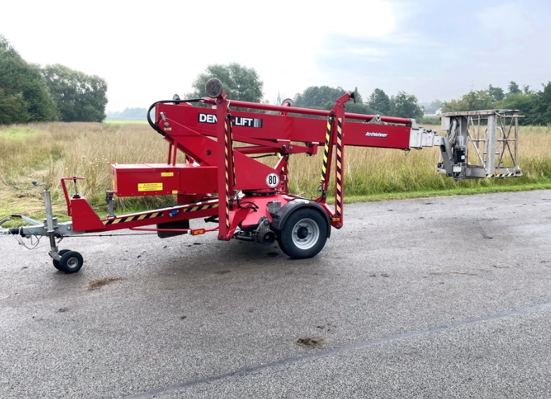 Na predaj prívesná pracovná plošina DENKA Lift DK18. Pracovná výška 18 m, nosnosť koša 200 kg, stranový dosah 11,30 m. Rok výroby 2015.